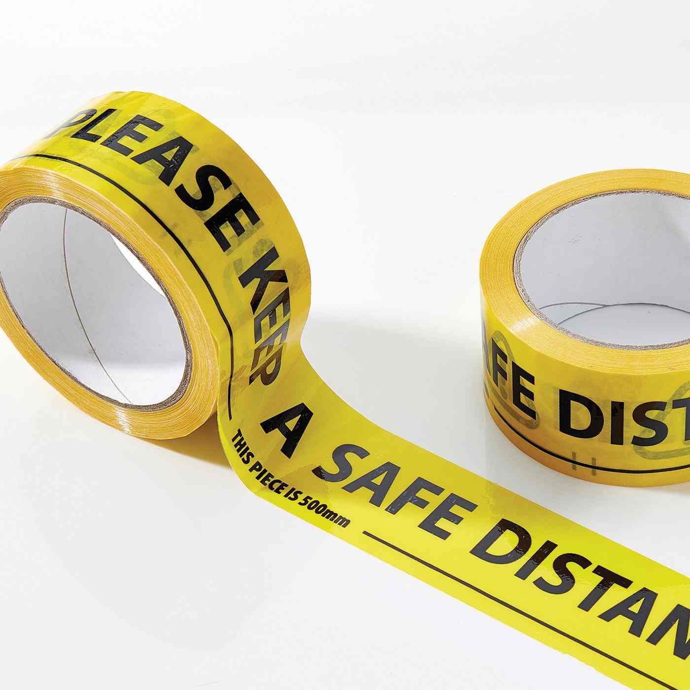 Everyday utility tape for floor marking. This black and yellow vinyl tape has the wording PLEASE KEEP A SAFE DISTANCE already printed on it, along with a 500mm distance indicator message. The product is scuff resistant and easy to clean. It can be used for internal areas to mark out safe distancing, including use in work areas or retail. Sold individually or boxed in 36 rolls.